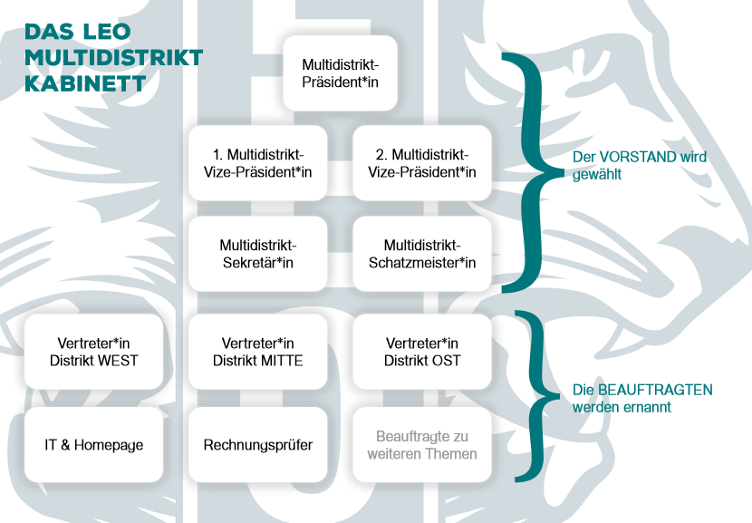 Der Präsident des LEO Multidistrikt hat auch einen festen Platz im Govornorrat, Österreichs höchstem LIONS-Gremium. Die drei LEO-Distriktvertreter tauschen sich im jeweiligen Kabinett der Distrikte Ost, Mitte bzw. West mit den LIONS-Freunden aus.